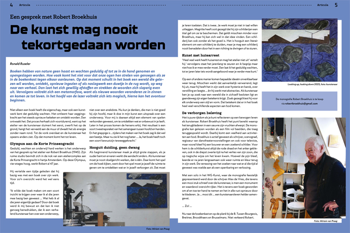 Als beginnend kunstenaar maak je altijd grote stappen, als je ouder bent en ervaren werkt die aandacht anders. Als kunstenaar moet je nooit doelgericht werken, dat is één. Daar komt het spel om de hoek kijken, want door het spel moet je jezelf de ruimte te geven om te ontdekken wat er in jezelf verborgen zit. Dat moet je leren toelaten. Dat is twee. Je werk moet je niet in taal willen uitleggen. Magritte heeft ooit gezegd dat hij zijn schilderijen een titel gaf om ze te beschermen. Dat geldt misschien minder voor Broekhuis, maar hij kan zich wel in dat idee vinden. Een schilderij kan ook zonder als het goed is. Het is hooguit een literair element om een schilderij te duiden, maar je mag een schilderij nooit benadelen door het in een richting te dwingen of te sturen.